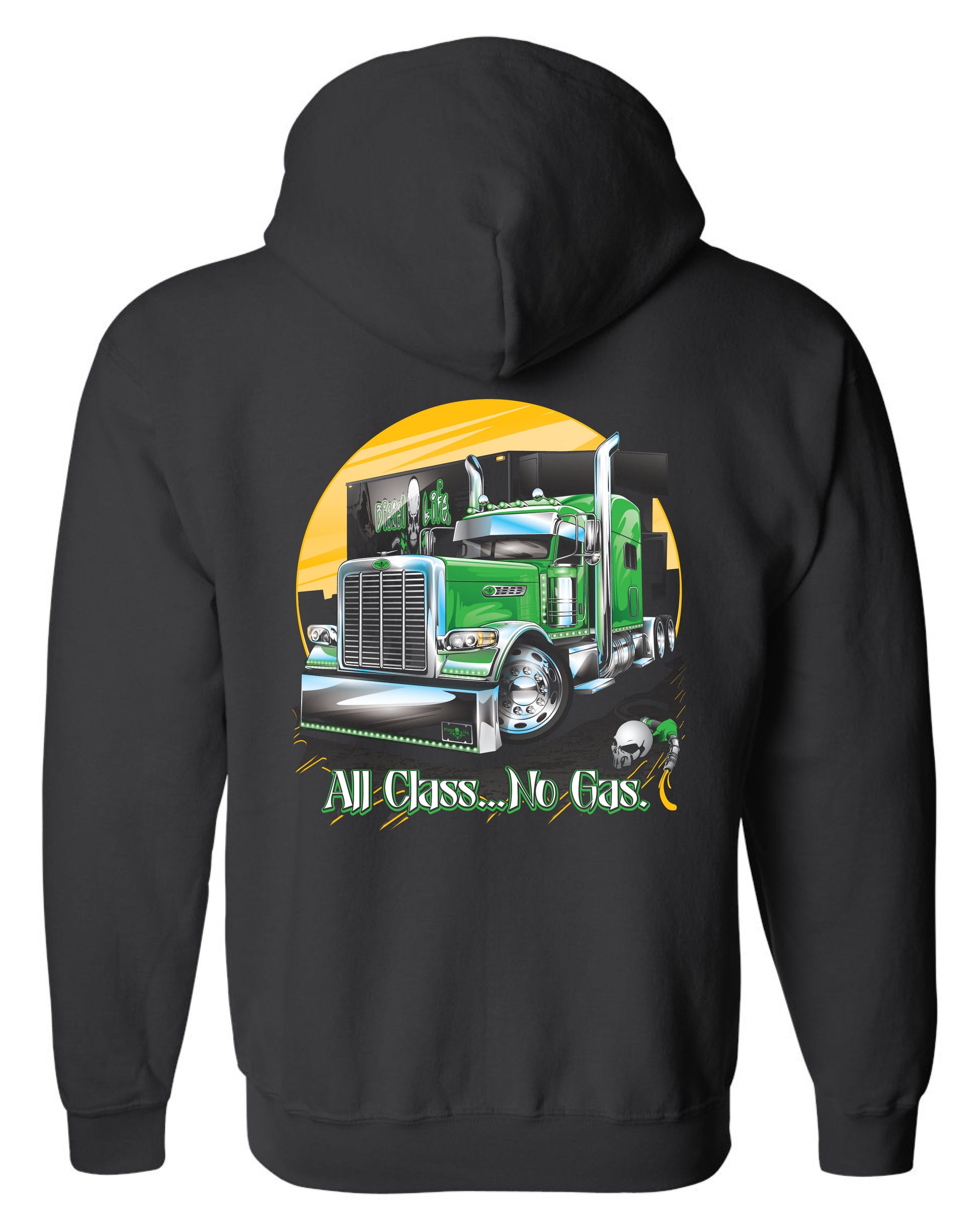 Back Graphic: Bright green diesel rig with the bold line “All Class... No Gas”